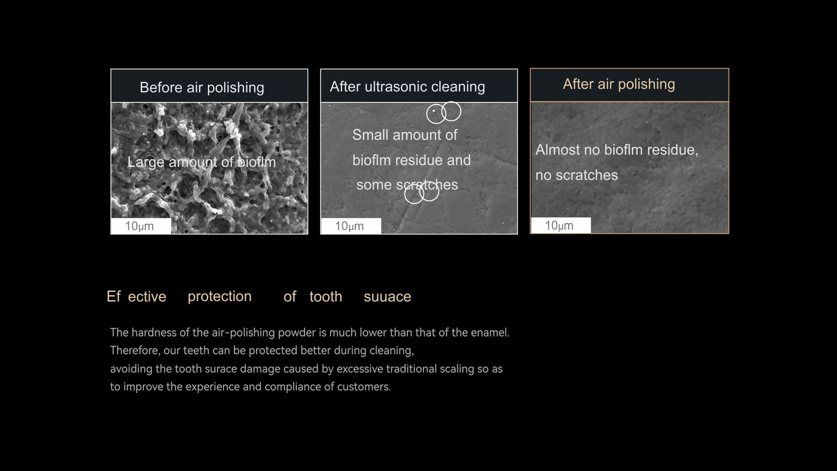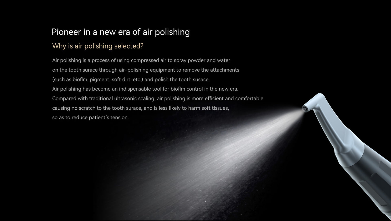Air polishing uses compressed air to spray powder and water onto the tooth surface to remove debris (such as biofilm, pigments, and soft dirt) and polish the tooth. It has become an essential tool for biofilm control in modern dentistry. Compared to traditional ultrasonic scaling, air polishing is more efficient and comfortable, does not scratch the tooth surface, and is less likely to harm soft tissues, reducing patient anxiety.