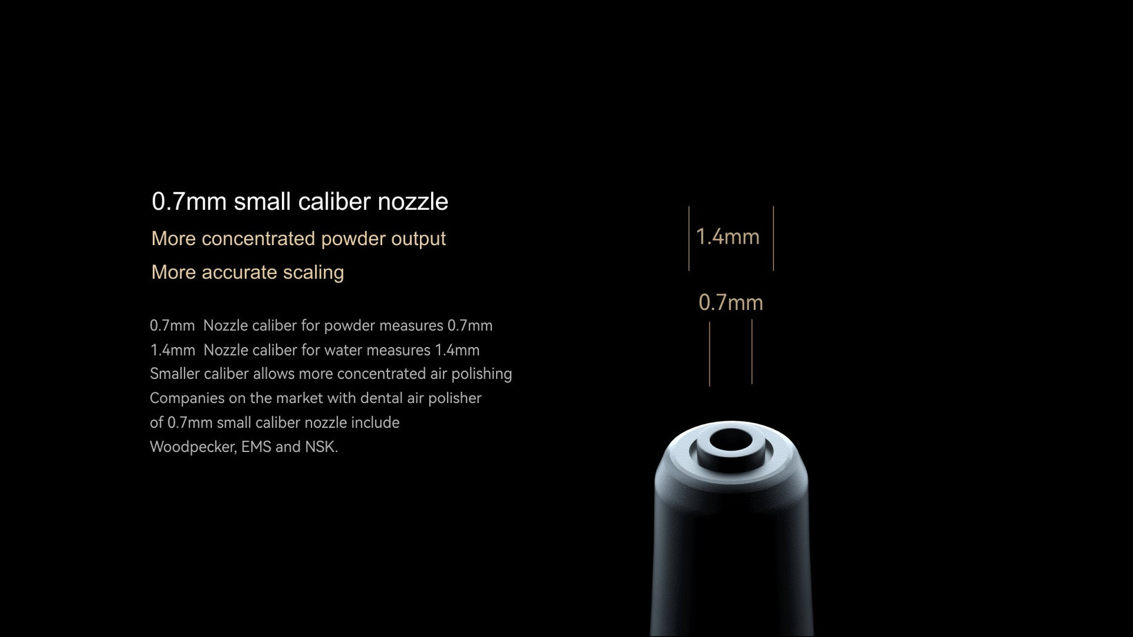 - Small-Caliber Nozzle: 0.7mm Nozzle calibre for powder measures 0.7mm 1.4mm Nozzle calibre for water measures 1.4mm A smaller calibre allows for more concentrated air-polishing Companies on the market with dental air polisher with 0.7-mm small-calibre nozzle include KaVo, M4, and NSK.