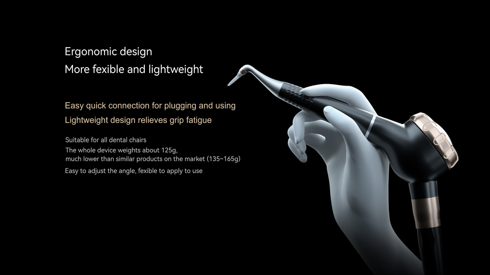 - Ergonomic Design: Lightweight and flexible, with a quick connection for easy use. The device weighs about 125g, lighter than similar products (135-165g), reducing grip fatigue, and is suitable for all dental chairs.
