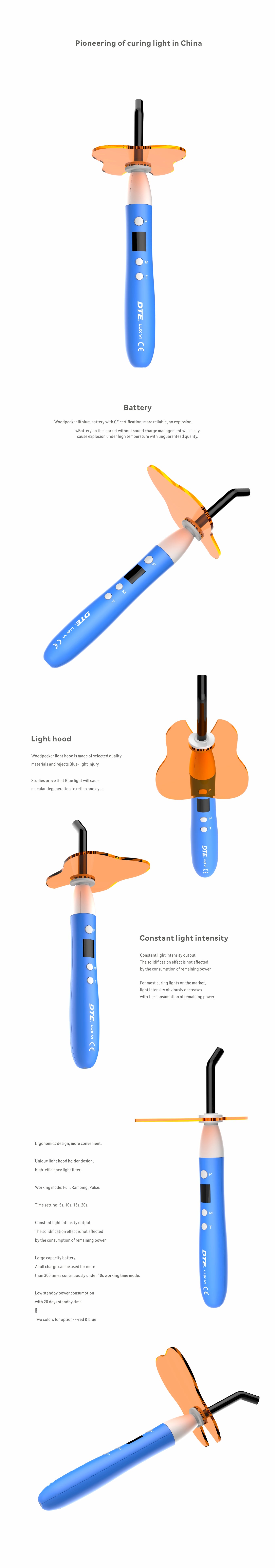Woodpecker DTE Curing Light LUX VI features an ergonomic design for enhanced convenience and a special light hood and holder to effectively filter light. With a full charge lasting over 300 uses at 10-second intervals, it offers reliability throughout procedures.
